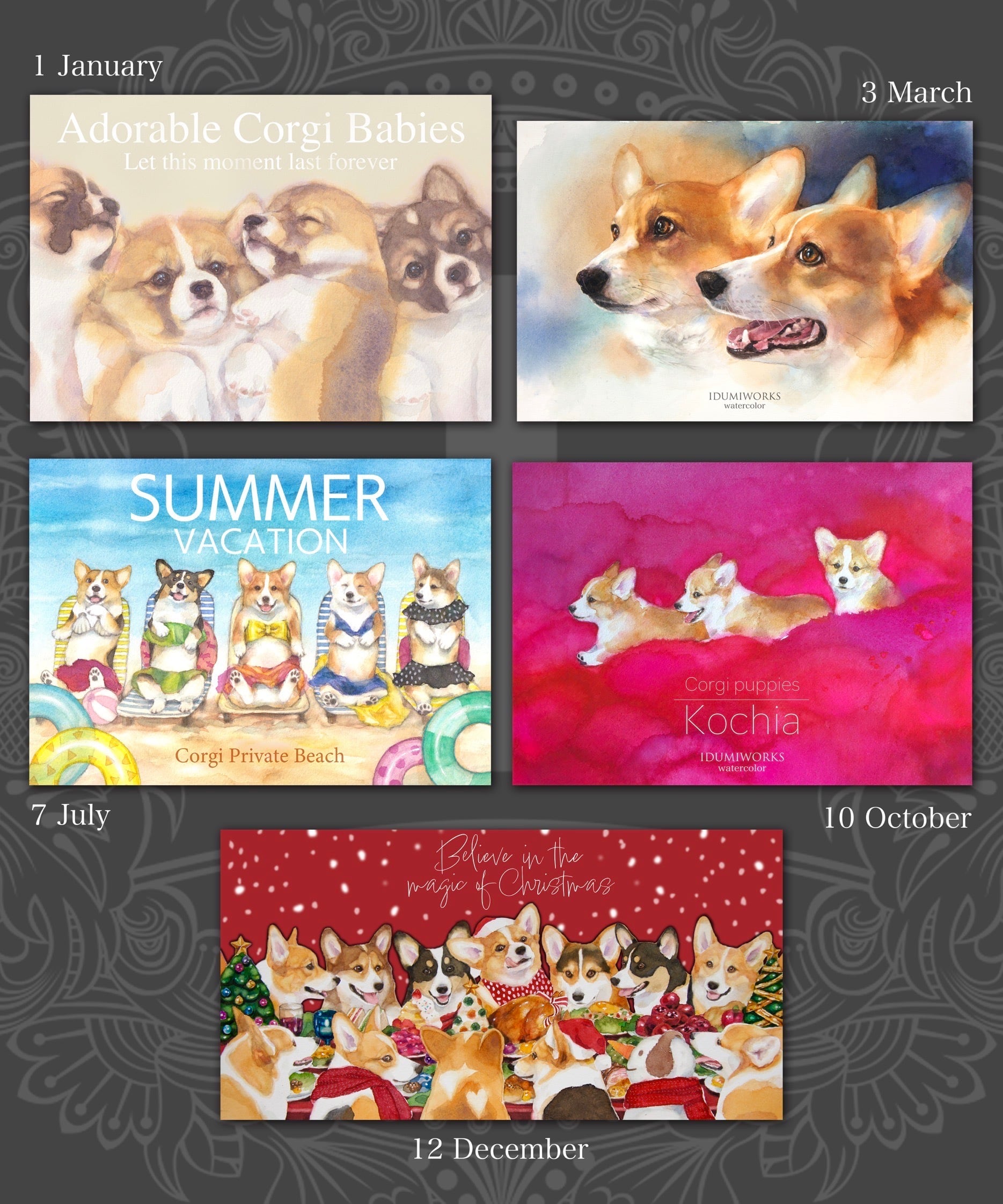 Idumiオリジナル、コーギーカレンダー。表紙を含め13作品の絵を収録。